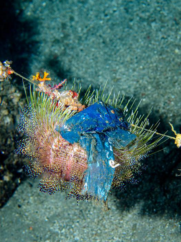 ריכוז גבוה של חלקיקי פלסטיק נמצא גם בשוניות עמוקות. שקית פלסטיק כחולה על קיפוד ים, בשונית בעומק 130 מטר בפיליפינים | Luiz Rocha © California Academy of Sciences