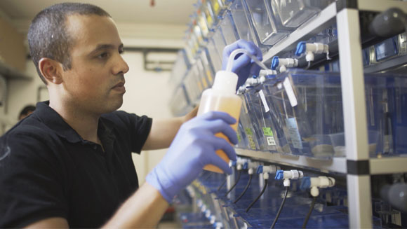 עושים בעצמנו את המניפולציות הגנטיות הדרושות. הראל עם הדגים במעבדתו בירושלים | צילום: בוריס דוזורצב