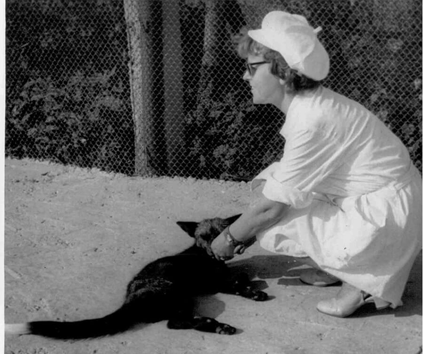סטודנטית המחקר של בליאייב, ליודמילה טרט, מלטפת את אחת הגורות במחקר ב-1974. מקור: באדיבות ליודמילה טרט והמכון לחקר התא ולגנטיקה