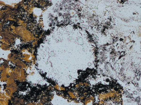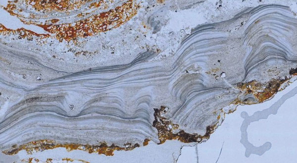 חיים על הסלעים: סלעים כתומים באזור פִּילְבָּרָה באוסטרליה קרויים גייזריט ומורכבים ממינרלים שניתזו מגייזרים במעיינות חמים (1). בחתך מיקרוסקופי אפשר לראות בסלעים פסים כהים אופייניים העשירים בטיטניום, ופסים בהירים המורכבים בעיקר מאשלגן (רוחב של כסנטימטר) (2). בועות זעירות שהשתמרו בגייזריט זה בן 3.5 מיליארדי שנים נוצרו בביופילמים דביקים, התוצרים של יצורים ביולוגיים (3).