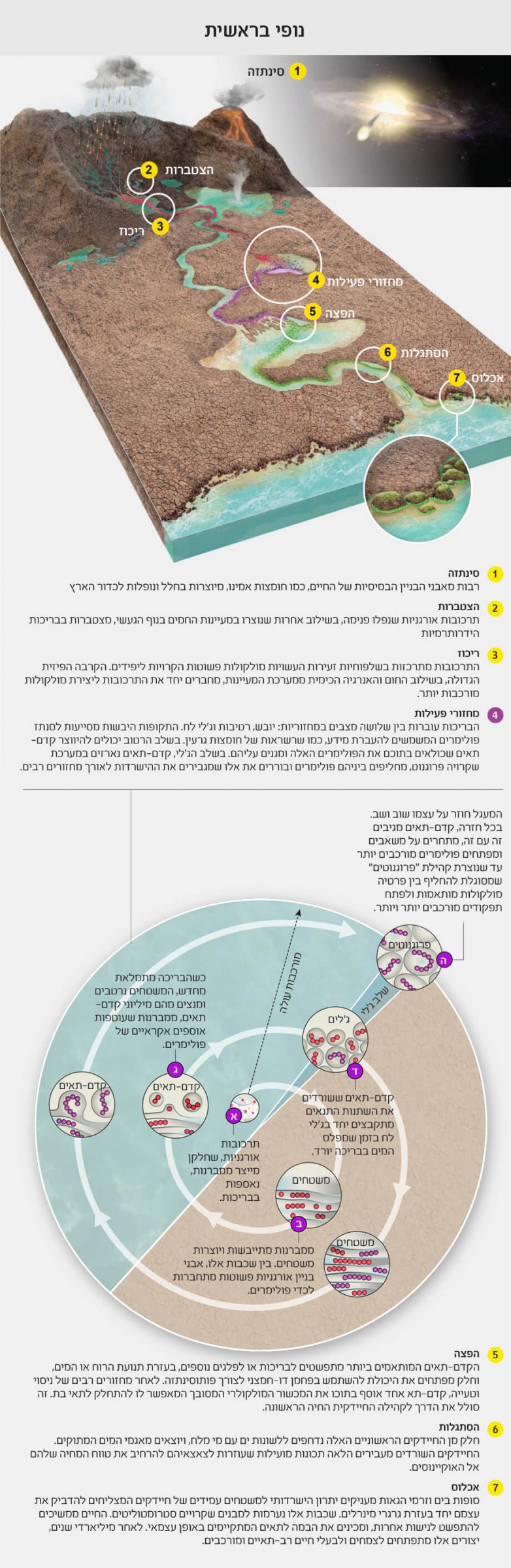 - מערכת בריכות געשיות ומעיינות חמים יבשתיים מכילה את המרכיבים הנחוצים לחיים, ומחזורי רטיבות-יובש כדי לאפשר קשרים בין מולקולות וברירה טבעית.
