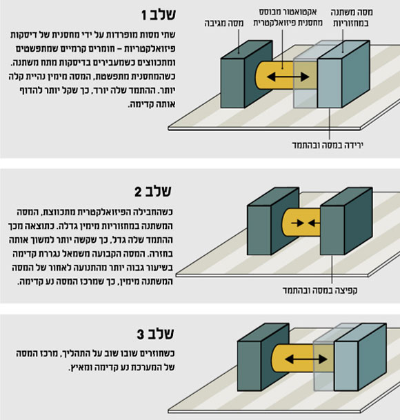 קשה לפסוק מה המשמעות של זה בפועל. אולם וודוורד ופירן ניסו להוריד את הרעיונות האלו לקרקע המציאות. בהינע החללי שלהם יש מחסנית מהודקת של "דיסקות פיזואלקטריות", כלומר חומרים קֵרָמִיים שמתפשטים ומתכווצים (כמו חתיכות נייר שמתקמטות ומתיישרות) כשמפעילים עליהם מתח חשמלי. חלק מהתאוצה הזאת משנה את האנרגיה הפנימית של הדיסקות, ולכן משנה את המסה שלהן: הן נהיות כבדות יותר, קלות יותר, כבדות יותר, קלות יותר. אם תמשכו אותן כשהן קלות ותהדפו אותן כשהן כבדות, תקבלו דחף – בלי שום צורך בדלק.