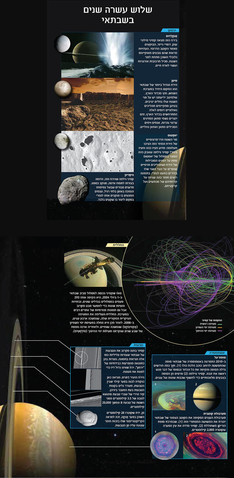 ב-15 בספטמבר 2017, כשמקור האנרגיה שלה הידלדל, צנחה החללית קסיני אל תוך האטמוספרה של שבתאי לאחר שהקיפה את כוכב הלכת במשך 13 שנה. לאורך המשימה סיפקה החללית שלל תגליות חסרות תקדים על כוכב הלכת המסובך הזה, על טבעותיו ועל מגוון ירחיו. היא גילתה עולמות שבהם נהרות של מתאן נשפכים לאגמים רחבי ידיים, שבהם סילונים של גבישי קרח ניתזים לחלל מתוך אוקיינוס תת־קרקעי ושבהם סופה יחידה מקיפה כוכב לכת שלם. לפניכם כמה נקודות ציון. מאת אדווארד בל.