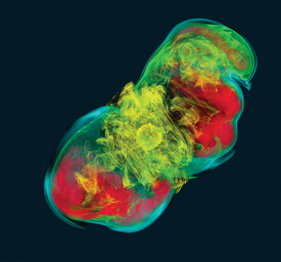 כמות החומר הקטנה הזאת שנמלטת מן החור השחור היא ככל הנראה עסק משונה: ים ערפילי של חלקיקים מנותקים, בעיקר נויטרונים, ולצִדם כמה פרוטונים ואלקטרונים. עם הירידה בלחץ הגז, החלקיקים יתחילו להיקשר זה לזה וליצור גרעינים כבדים יותר. הפרוטונים ידחו זה את זה בגלל המטען החשמלי החיובי שלהם, אבל לנויטרונים אין מטען והם נצמדים לחלקיקים אחרים ביתר קלות. באמצעות תוספת הדרגתית של נויטרונים, ייעשו הגרעינים כבדים יותר ויותר, וייצרו גשם של יסודות מן המחצית התחתונה של הטבלה המחזורית, כמו זהב, פלטינה וכספית, מעורבים בתוך סוגים שונים ומשונים של פסולת רדיואקטיבית, כמו למשל אורניום ותוריום. התנגשויות כוכבי נויטרונים הן אחד המקומות הספורים ביקום שבהם מדענים סבורים שיסודות כבדים כאלה יכולים להיווצר.