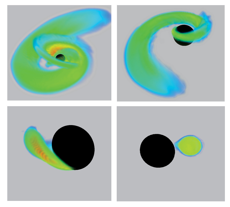 התנגשות: הדמיית מחשב של כוכב נויטרונים (ירוק) מתמזג עם חור שחור. התהליך הזה דומה למה שמדענים משערים שמתרחש כששני כוכבי נויטרונים מתאחדים, תרחיש שיוכל להסביר כמה סופרנובות תת־בהירות. כאן, כוכב הנויטרונים מתעוות על ידי הכבידה של החור השחור (1 ו-2). מעט חומר נפלט ויוצר זנב (3), והשאר מתלפף סביב החור השחור (4). לבסוף, כמעט כל כוכב הנויטרונים נבלע.