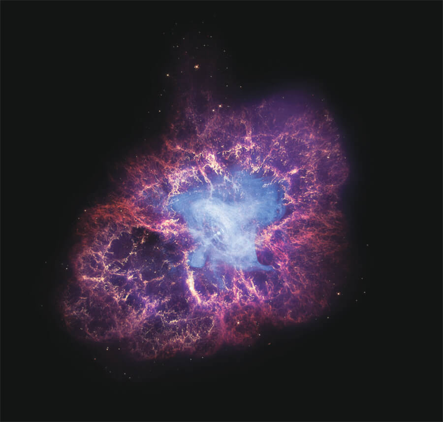 ערפילית הסרטן: שיירי הסופרנובה האלה זוהרים באנרגיה המגיעה מכוכב נויטרונים מסתחרר שמניע מערבולת של פלזמה ממוגנטת (נראית בכחול בתמונה)