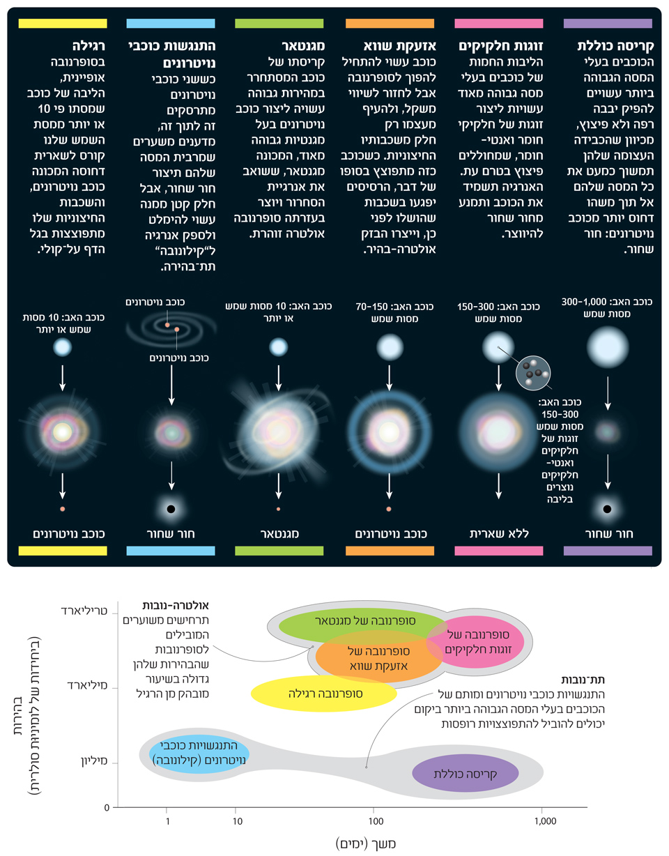 לא זו בלבד שאנחנו אוספים עוד סופרנובות, אנחנו אף חושפים סוגים חדשים ומשונים שלהן. יש התפוצצויות כוכביות הזוהרות באור עז מאין כמוהו, בהירות פי 100 יותר מסופרנובות רגילות; אחרות הן דווקא עמומות פי 100. כמה מהן צבועות באדום עמוק; אחרות באולטרה סגול. יש הזוהרות באור עז במשך שנים; אחרות דועכות בתוך ימים ספורים. מתברר שמוות כוכבי הוא הרבה יותר מגוון ממה שהעלינו על דעתנו.