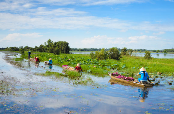 איכרים שטים בשדה לוטוס מוצף בדלתת המקונג | צילום: שאטרסטוק