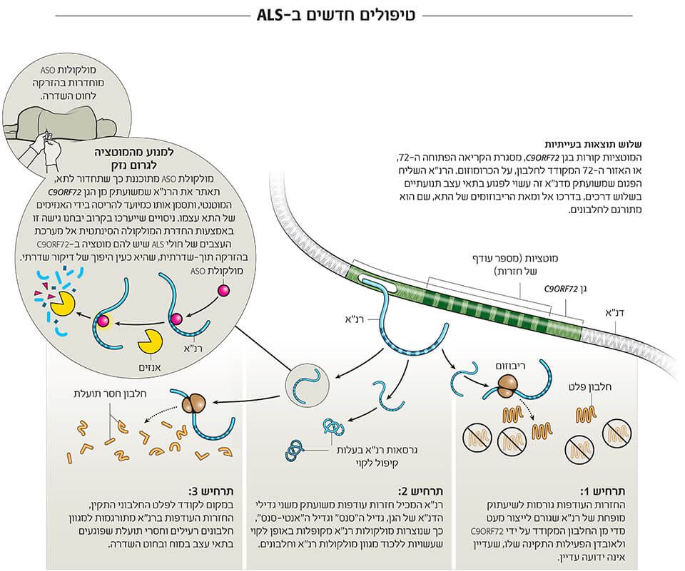 מחקרים עדכניים העלו שיותר מדי חזרות של "אותיות" דנ"א לאורך כרומוזום 9 אחראיות למרבית המקרים התורשתיים ולחלק מן המקרים האקראיים של ALS. בשעה שחוקרים מפענחים את האופן שבו מוטציות אלו גורמות למחלה, מפתחי תרופות בוחנים מולקולה סינתטית, הקרויה אוליגונוקלאוטיד אנטי-סנס, או ASO, כדי להשתיק את המוטציות.