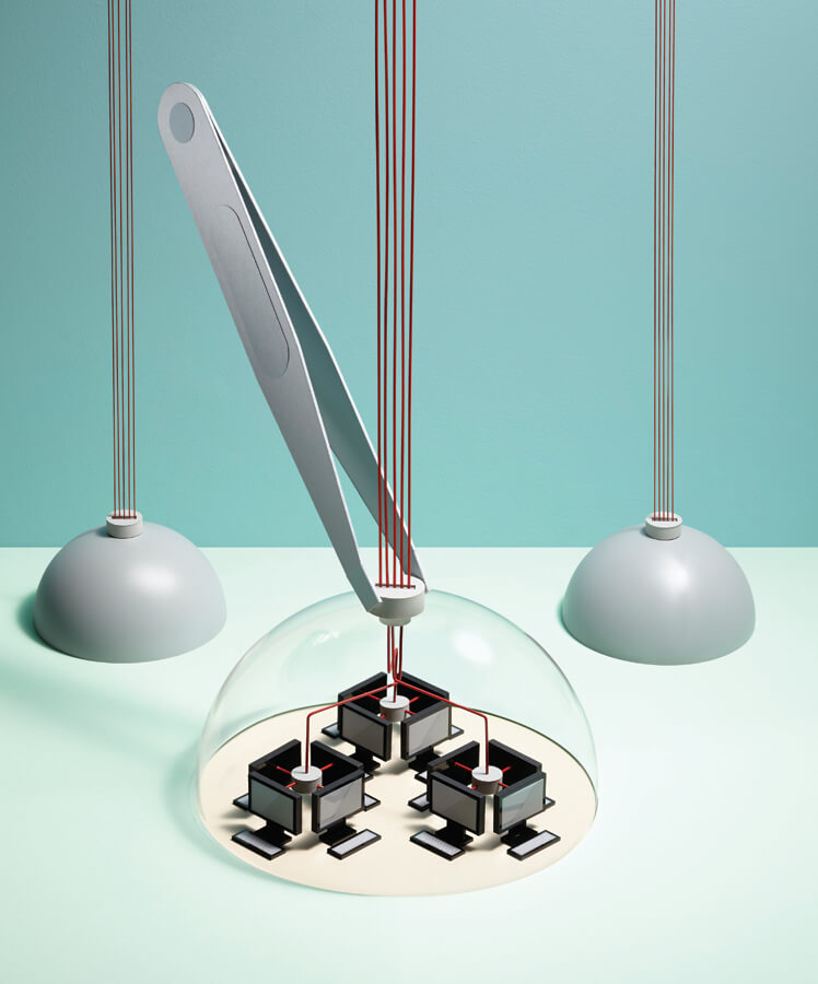 מחשבים שינצלו את החוקים המוזרים של מכניקת הקוונטים יוכלו, בתיאוריה, לבצע חישובים שמחשבים קלאסיים אינם מסוגלים לבצע. אלא שככל שהמחשבים הקוונטיים גדולים יותר, קשה יותר לשַמֵר את התכונות הקוונטיות שלהם (למטה). מדענים סבורים שהפתרון לכך הוא לבנות מחשבים קוונטיים קטנים רבים, ולחבר אותם לכדי שלם גדול יותר, אסטרטגיה הקרויה מִחשוב קוונטי מודולרי. בתיבות למטה מוצגים שלושה אופני ארגון אפשריים, המבוססים על סוגים שונים של ביטים קוונטיים, או קְיוּבִּיטים. (איור: ג'ן כריסטיאנסן)