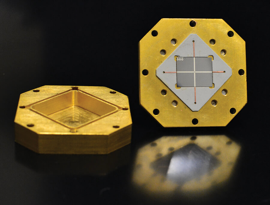 התקן קוונטי: מעגל למדידה של קְיוּבִּיטים מוליכי־על ארוז בתוך קופסה מצופה זהב. מדידות כאלה יכולות לשזור קְיוּבִּיטים המצויים בצבירים נפרדים, או "מודולים", וכך לקשר בין המודולים וליצור מחשב קוונטי מאוחד.
