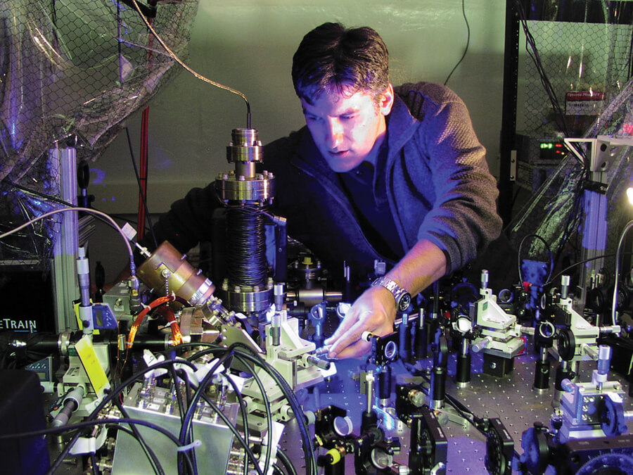 במעבדה: המחבר כריסטופר ר' מונרו מתפעל קְיוּבִּיטי יונים אטומיים בעזרת קרני לייזר ולוכד אותם במלכודת עשויה משדות אלקטרומגנטיים שמופקים באמצעות אלקטרודות.
