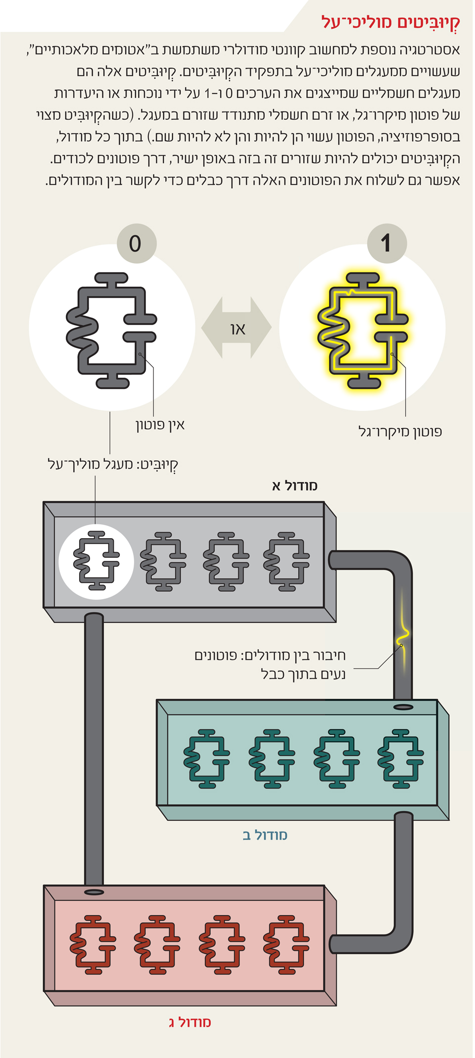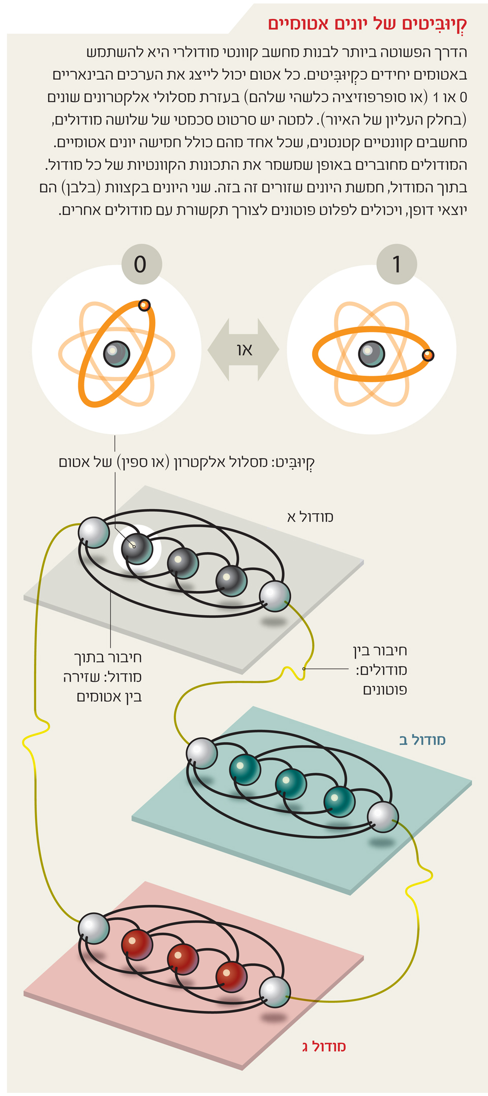 ייתכן שבניית מערכת גדולה, שתסתמך על החוקים הקוונטיים ותוכל לעבד מידע קוונטי בנפחים משמעותיים, מחייבת גישה מודולרית. בגישה כזו, יחידות קוונטיות קטנות ומוכחות יחוברו בדרך שלא תשבש את טבען הקוונטי. ניסויים מוצלחים בקנה מידה מוגבל שנעשו לאחרונה העבירו את הגישה המודולרית מן התיאוריה אל מגרש המציאות, והם סוללים את הדרך למימוש הפוטנציאל הייחודי של מחשבים קוונטיים.