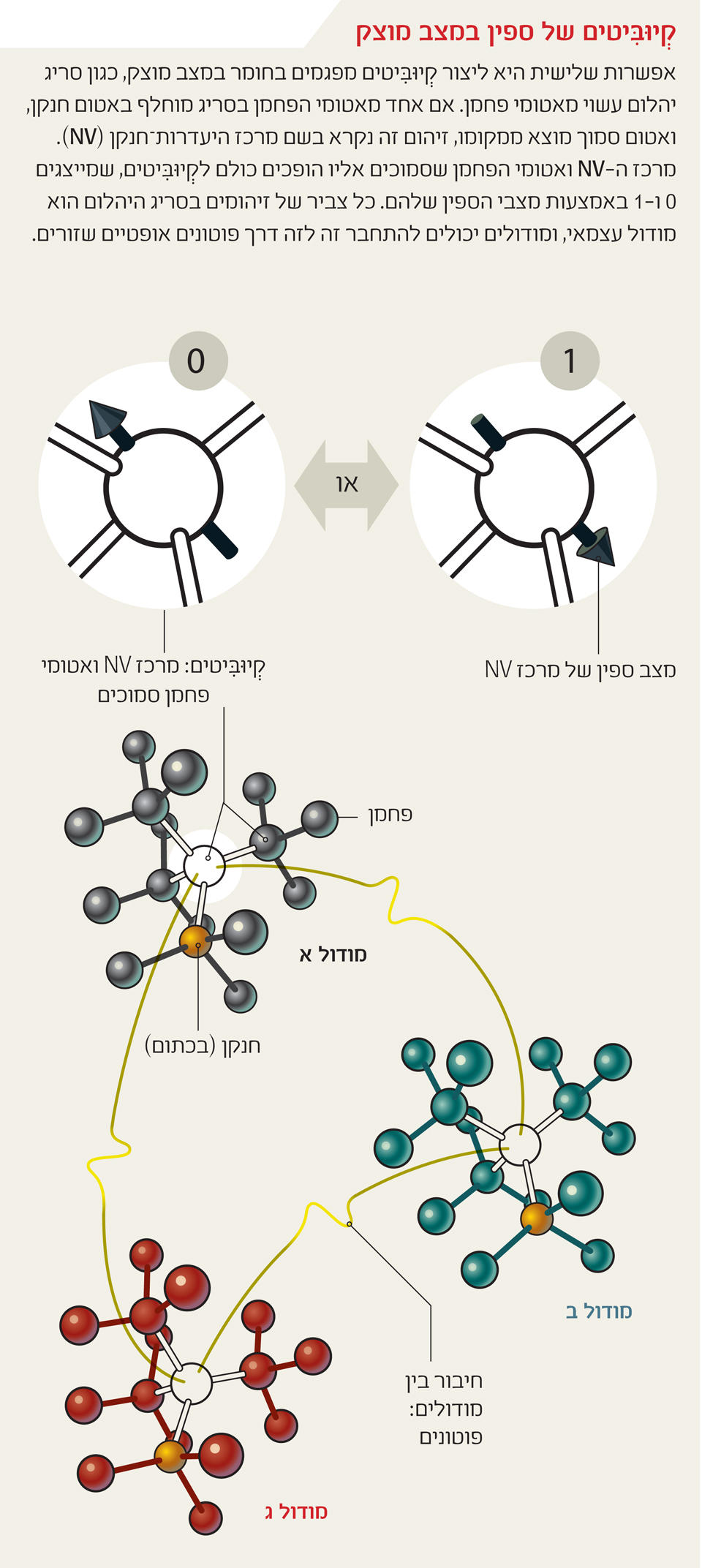 הסוג השלישי והאחרון של קְיוּבִּיטים מקודד מידע במצבי ספין בתוך חומרים במצב מוצק. יש מודלים שונים של קְיוּבִּיטים כאלה, אך אחת השיטות המבטיחות, שנחקרת על ידי אחד מאִתנו (לוקין) ועל ידי קבוצות נוספות, מסתמכת על זיהומים בגבישים כדי ליצור קְיוּבִּיטים. לדוגמה, סריג יהלום, המורכב מאטומי פחמן, שאטום אחד בו מוחלף באטום חנקן והאטום הסמוך לו חסר. זיהום כזה מכונה "מרכז היעדרות־חנקן" (NV), ואפשר לשלוט בספין האלקטרוני שלו בעזרת פולסים אלקטרומגנטיים. לוקין ועמיתיו פיתחו שיטה שבה מרכז NV מגיב לספין הגרעיני של אטומי הפחמן הצמודים אליו, ויוצר כך צביר של קְיוּבִּיטים סמוכים, שמקורם באינטראקציות מגנטיות בין החלקיקים. לרוע המזל, למרכז כזה יש מעט מאוד אטומי פחמן שכנים, כך שמספר הקְיוּבִּיטים הכולל בכל מודול מוגבל לתריסר או פחות.