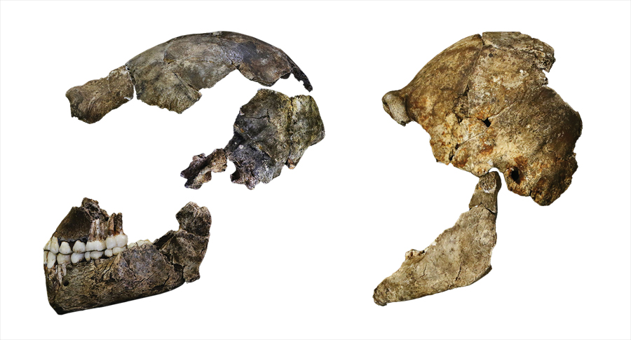 הומו נַאלֶדי מעורר תהיות באשר למוצא המין האנושי ולאבולוציה שלו. בהעתק מדויק זה של גולגולת משוחזרת, האזורים הלבנים מציינים עצמות חסרות.