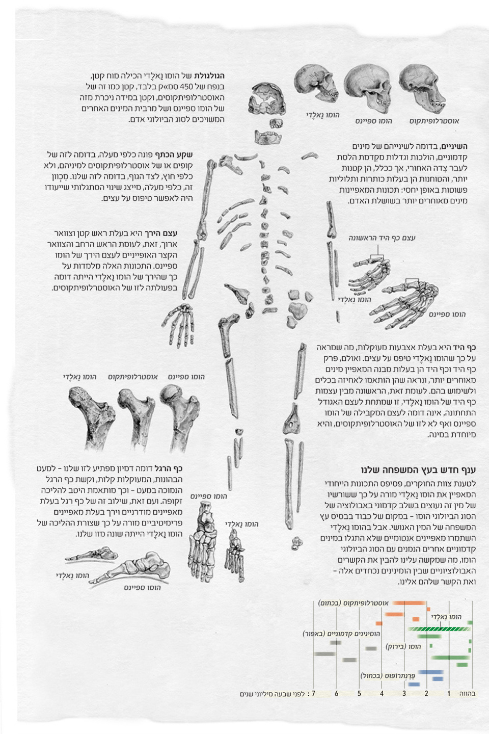 באולם המאובנים החדש באוניברסיטת ויטְוַואטֶרְסְרַאנד ביוהנסבורג שבדרום אפריקה, כבר כמעט לא נותר מקום על המדפים. הארונות בעלי דלתות הזכוכית המעטרים את קירות האולם מלאים עד אפס מקום בעצמות של אבות אבותינו הקדמונים שהתגלו במהלך 92 השנים האחרונות במערות הרבות הפזורות באזור שנודע בכינוי "ערש המין האנושי" המצוי במרחק של 40 קילומטרים בלבד מצפון־מערב ליוהנסבורג. מאגר המאובנים של מינים נכחדים של אדם קדמון שנמצאו באזור זה הוא אחד הנרחבים ביותר מסוגו בעולם. ואולם, לאחרונה הוכפל היקפו של האוסף עם גילוי מאות פריטים במערכת מערות הידועה בשם "כוכב עולה". לדברי הפלאו־אנתרופולוג לי ברגר ועמיתיו, שחשפו וניתחו את שרידי השלדים הקדומים, מאובנים אלה מייצגים מין אנושי (species) שלא היה מוכר עד כה: הומו נַאלֶדי, שכונה כך על שם המילה "כוכב" בשפת סותו של בני המקום. שרידי המאובנים האלה מעמידים בספק כמה מן הדעות המושרשות עמוק בתודעתנו בדבר המוצא והאבולוציה של הסוג הביולוגי (genus) שאליו אנחנו משתייכים, אדם (Homo).