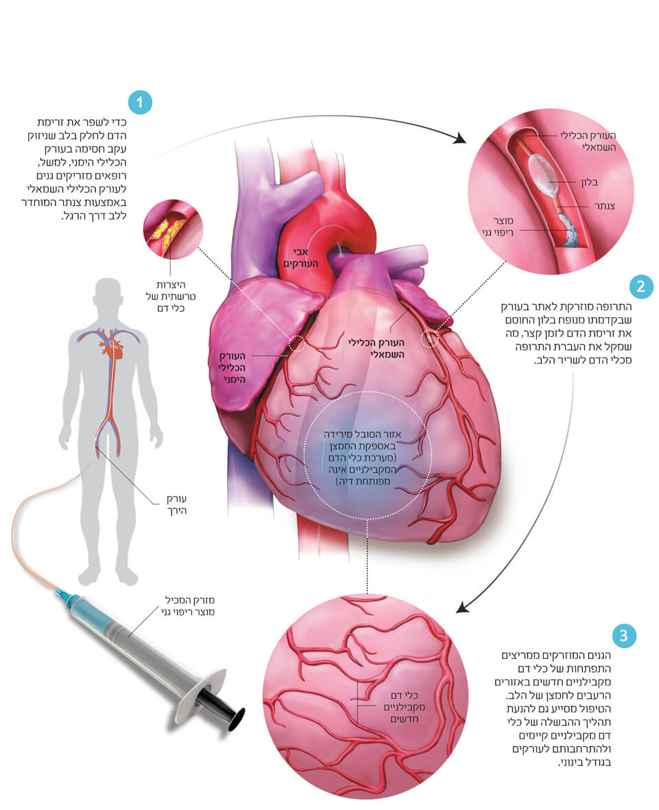 זה שני עשורים מנסים אנשי מחקר, ובהם כותב שורות אלה, למצוא דרכים לדרבן את הלב ליצור כלי דם מקבילניים שיוכלו להזרים דם בכמות מספקת לסיבי שריר הלב כשאין הם מקבלים די חמצן. באופן הזה, אנחנו מקווים להקל את הכאב המעיק על מטופלים הסובלים מטרשת עורקים וכן למנוע התקפי לב במקרים שבהם אין אפשרות להיעזר בהחדרת תומכנים או בניתוח מעקפים. עד עתה מאמצינו, שכללו בין השאר, הזרקת חלבונים, גנים ותאים ללב, לא הניבו תרופה יעילה דיה שבכוחה יהיה לסייע למרבית הסובלים מהיצרות חמורה של העורקים. עם זאת, במהלך השנים האחרונות שוכללו ההליכים האלה באופן דרמטי במסגרת ניסויים שעורכים אנשי מחקר באקדמיה ובמעבדות של תעשיית התרופות. כמה מן ההליכים האלה משמשים כיום בניסויים קליניים בבני אדם, והשלמתם צפויה כבר בעתיד הקרוב.