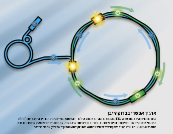 כדי להתקדם אנחנו זקוקים לנתוני ניסוי. כאן עולה על הבמה מאיץ האלקטרונים-יונים (Electron-Ion Collider, או EIC). בשונה ממרסקי אטומים אחרים, כמו מאיץ ההדרונים הגדול של מעבדת CERN ליד ז'נווה או מאיץ היונים הכבדים היחסותיים (RHIC) בארצות הברית, שמטיחים זה בזה חלקיקים מורכבים כמו פרוטונים ויונים, ה-EIC עתיד להטיח פרוטונים וניטרונים באלקטרונים. לאלקטרונים אין מבנה פנימי והם הפכו למעין מיקרוסקופ שיכול להציץ לתוך החלקיקים המורכבים.
