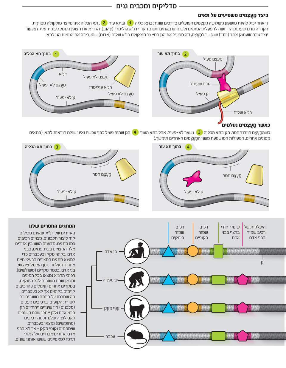 - שלושה מקטעים התבררו כמתגי דנ"א, ואיבוד שניים מהם אִפשר את גידול המוח בבני אדם ואת יכולת האדם ליצור קשרים זוגיים.