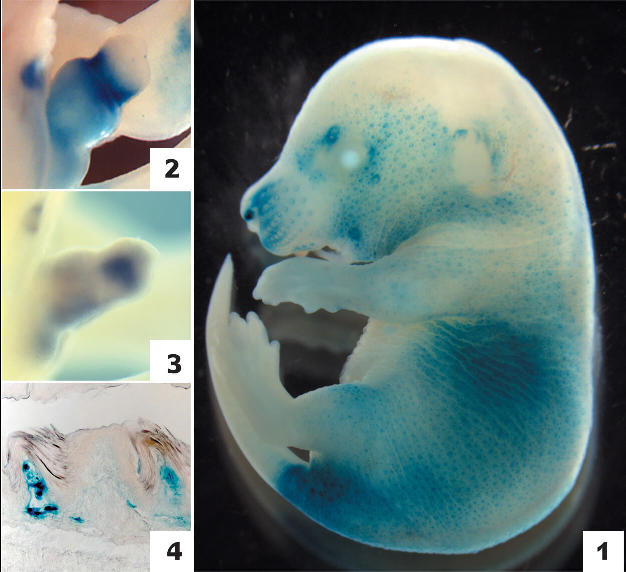 מבחן העכבר: כדי לראות מה עושה מתג גנטי, הזריקו מדענים לעוברי עכבר מתגים כאלה כשהם מחוברים לדנ"א הגורם לצביעת התאים בכחול כשהמתג פעיל. צבע כחול נראה בנקודות שהתפתחו לזיפי חישה ולזקיקי שיער אחרים (1) ובתאים שיוצרים פין או דגדגן ובלוטות של שדיים (2). שיטות אחרות הראו שהמתג קרוב מאוד לגן המאפשר לתאים להגיב להורמוני מין כמו טסטוסטרון (3), ובזכרים בוגרים המתג פעיל מאוד בתאים שיוצרים עוקצים בפין (4).