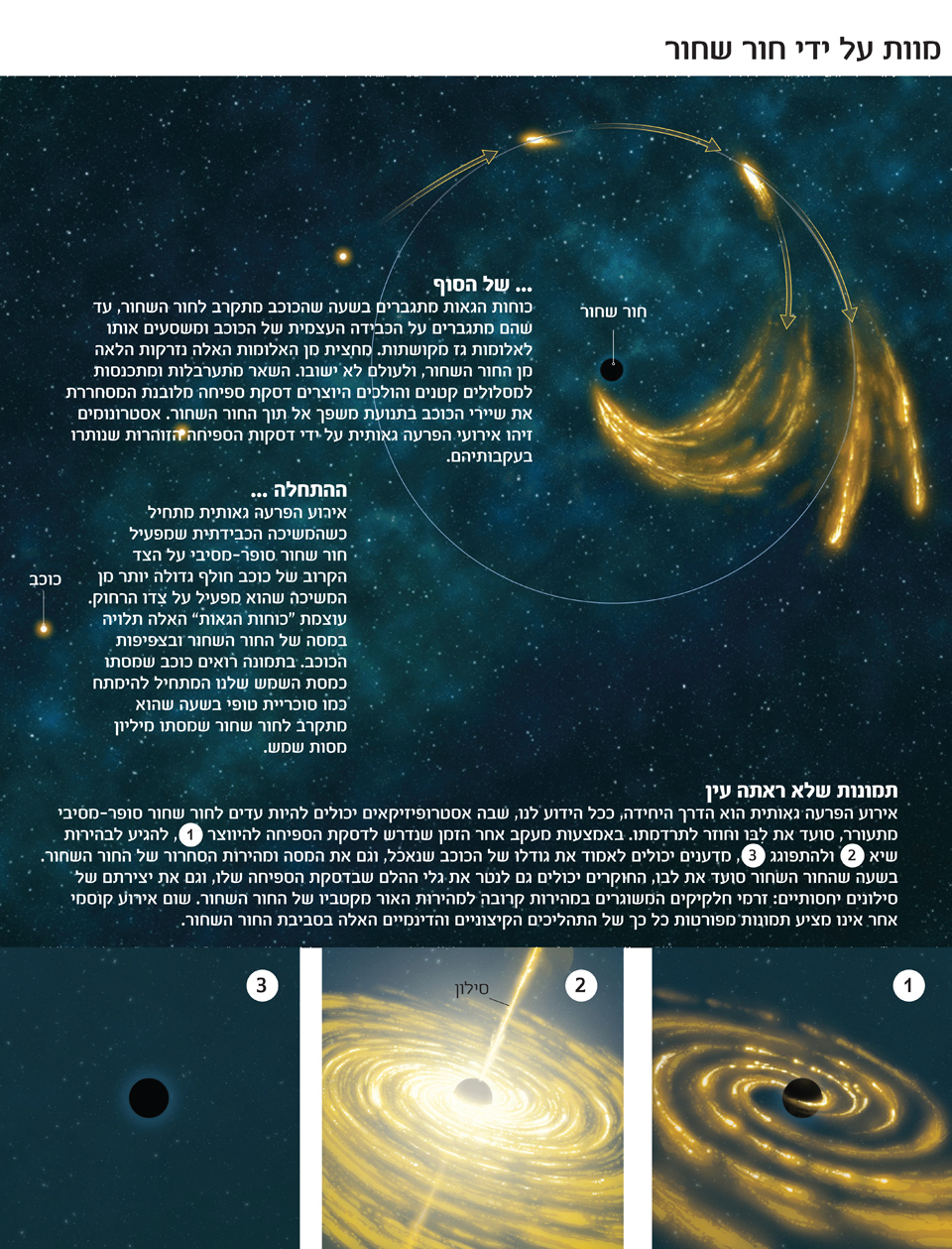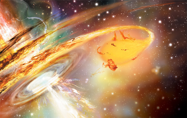 - כוכב החולף קרוב מדי לחור שחור סופר-מסיבי ייקרע לגזרים על ידי כוחות גאות וייבלע בתוך החור.