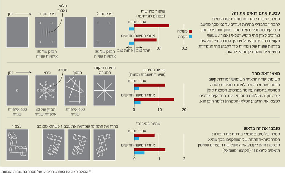 (מקור: פלסטיות של המוח במהלך החיים: למידת לימוד ומשחקי פעולה. מאת דפנה בבלייה ועמיתיה, Annual Reviow of Neuroscience, כרך 35, יולי 2012; איור: ג’ן כריסטיאנסן)