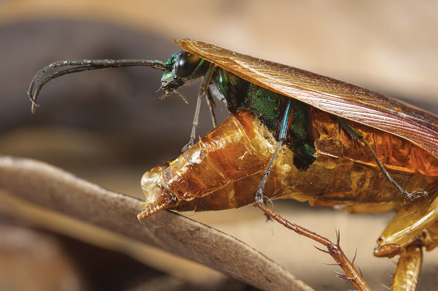 לאחר שגדלה והזינה את עצמה בתוך התיקן המארח שלה, מגיחה הצרעה הצעירה ומתחילה מחזור חיים מבעית חדש. (צילום: אלמי)