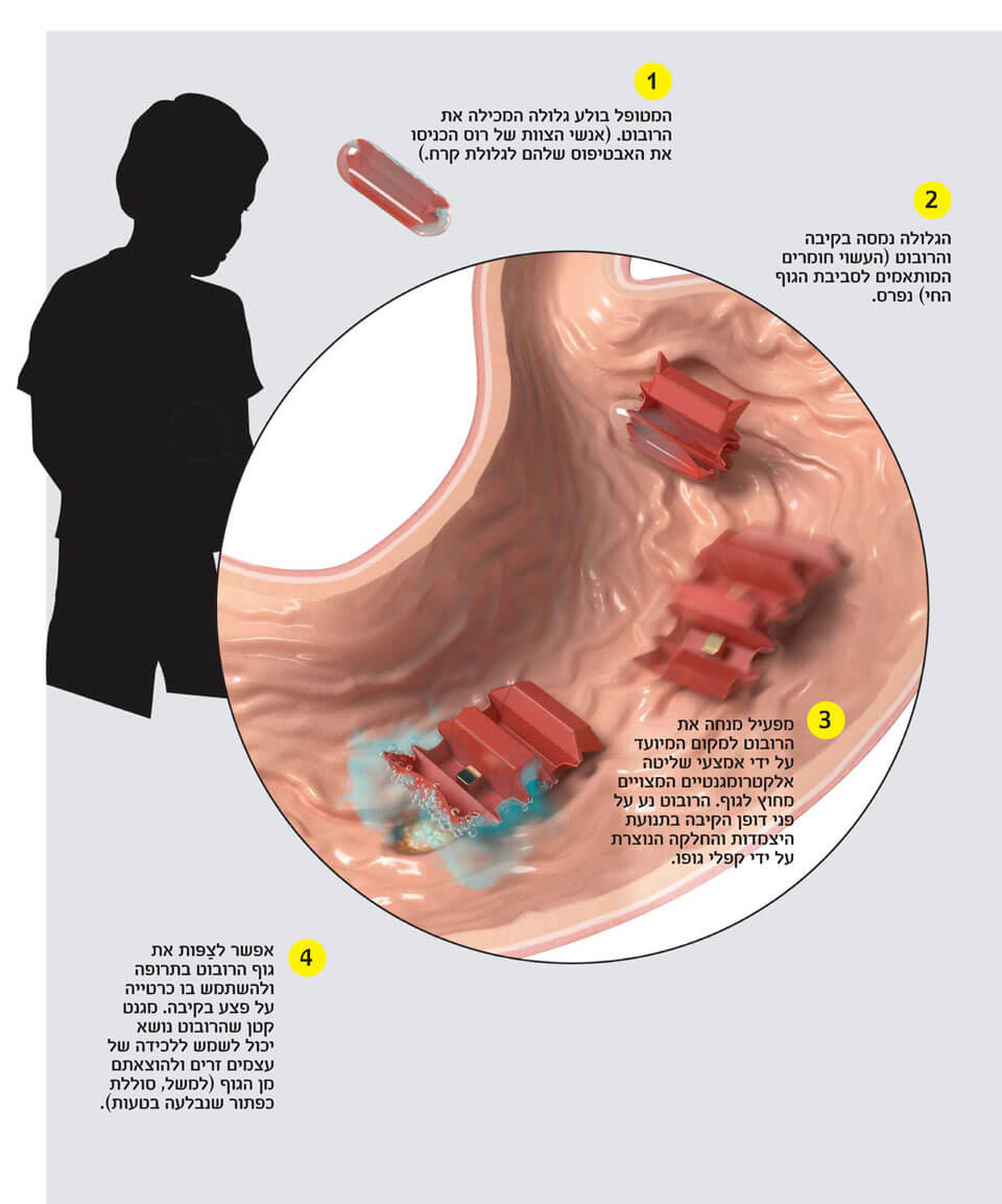 הרושם הרווח הוא שככל שהתערבות רפואית מתקדמת יותר כן היא פחות פולשנית. ניתוחים בריאטריים לטיפול בהשמנת־יתר, לדוגמה, היו כרוכים בעבר בפתיחה הבטן, מן הטבור ועד לסרעפת. כיום נעשים ניתוחים כאלה בשיטה לפרוסקופית, דרך חתכים שאורכם לא עולה על כמה סנטימטרים. עכשיו בנו חוקרים מן המכון הטכנולוגי של מסצ'וסטס (MIT) אבטיפוס של רובוט המסוגל לבצע הליכים פשוטים בתוך הקיבה ללא חתכים כלל וללא צורך בחיבור לציוד חיצוני: המטופל פשוט בולע את הרובוט.