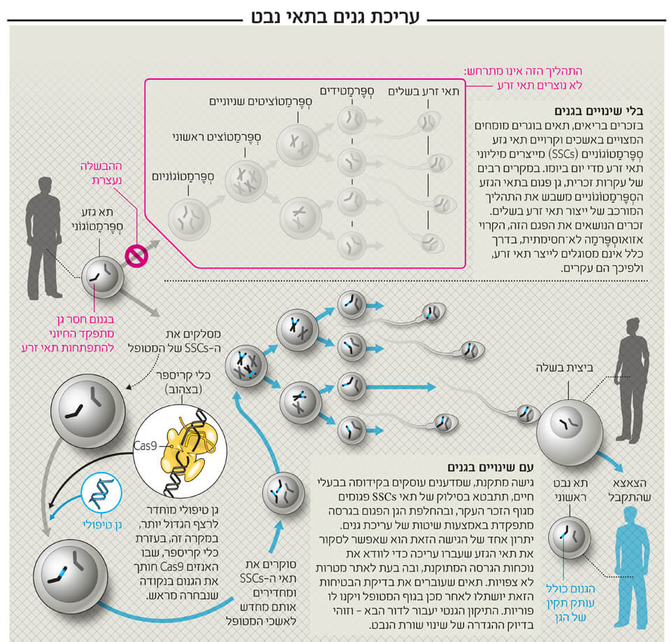 - ייתכן שבקרוב ישמשו שיטות חדשות לעריכת גנים בטיפולים בעקרות זכרית הכרוכים בהכנסת שינויים בקוד הגנטי של תאי זרע. שינויים כאלה יועברו לדורות הבאים, והם יהיו שינוי נצחי בגנום האנושי.