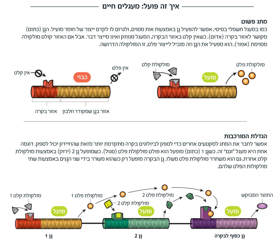 - השינוי כרוך בחיבור של גֶנים המקודדים חלבונים למתג, בצורה דומה למעגלים חשמליים שיש בהם חיבור של מוליכים לנגדים ולקבלים.