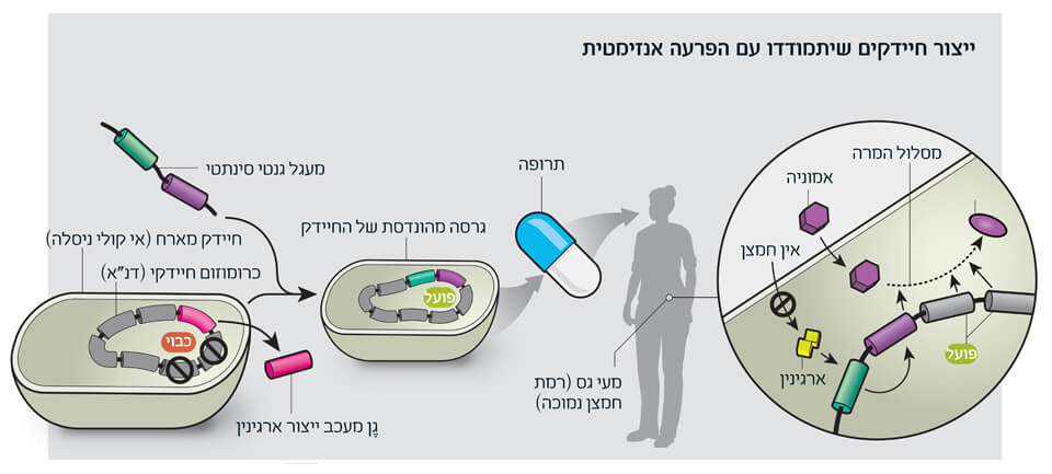 חוקרים העובדים בחברת ההֶזנק הביוטכנולוגית Synlogic, הפועלת בקיימברידג' שבמסצ'וסטס, יתנו למטופלים מנות יומיות של גלולה או משקה עמוסים במיליארדים של חיידקי אשריכיה קולי. החיידקים האלה שוכנים להם בדרך כלל במעיים שלנו, לעתים רחוקות הם גורמים לדלקות זיהומיות, אבל על פי רוב הם אינם מזיקים לאיש. המיוחד לחיידקי אי קולי אלה הוא בכך שהחוקרים בנו מחדש חלקים מן הדנ"א שלהם במטרה להפוך את התאים הזעירים האלה למכונות טרף החותרות ללא לאות לזלול כמויות אדירות של אמוניה רעילה בגופם של המטופלים.