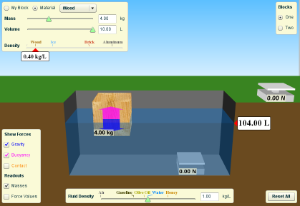 קחו את תיבת העץ והניחו אותם בתוך הנוזל. תוכלו פשוט להניח אותה או לנסות להטביע אותה ואז לשחררה, בכל מקרה תראו שהתיבה צפה. אם תסמנו את כוח הציפה תוכלו עכשו לראות שהוא שווה לכוח המשיכה, לכן התיבה צפה. בצד ימין תוכלו לראו בכמה עלה מפלס הנוזל – הנתון מיוצג בליטרים. זכרו שנפח הנוזל שנדחה על ידי התיבה, כלומר כמות הליטרים שנוספו לנפח הנוזל היא זו שכוח המשיכה הפועל עליה, כלומר המסה שלה, שווה למסת התיבה. באמצעות הנתון הזה תוכלו לחשב מהי הצפיפות של המים או של השמן.