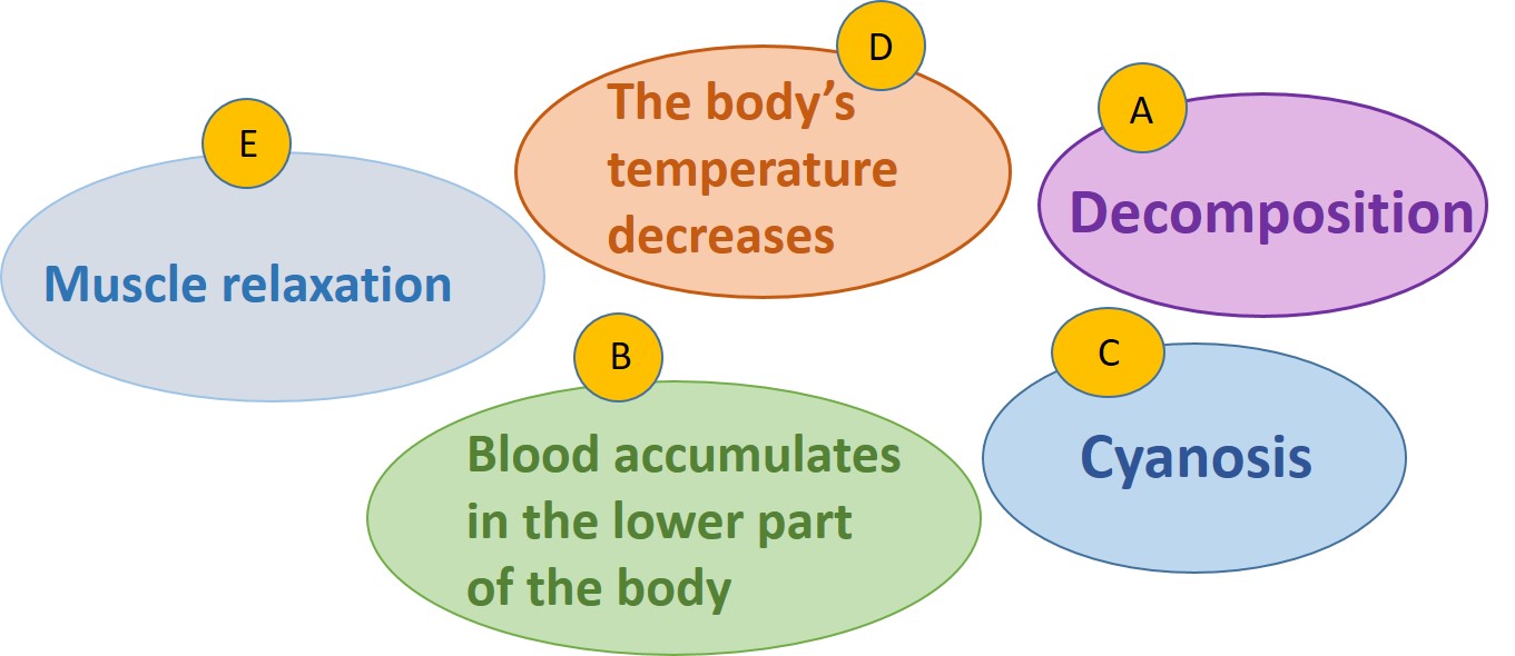 The image below shows different stages that occur in the process after death.Choose the answer that depicts the stages in the correct order from the moment of death.A. DecompositionB. Blood accumulates in the lower part of the bodyC. CyanosisD. The body’s temperature decreasesE. Muscle relaxation