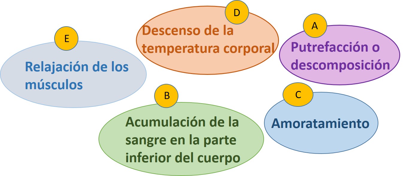 En la siguiente ilustración se muestran las distintas fases del proceso que se desencadena tras la muerte. Selecciona la respuesta que muestra las fases en el orden cronológico del proceso.